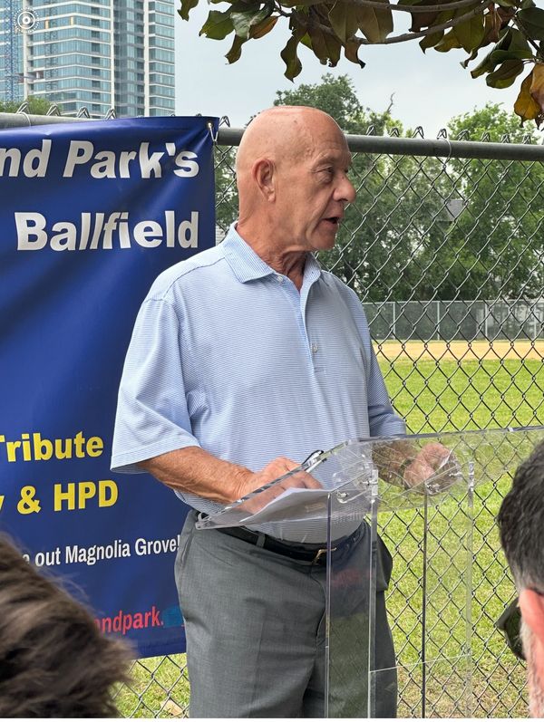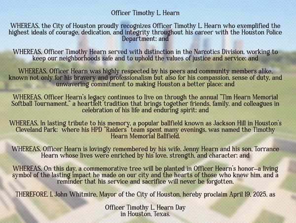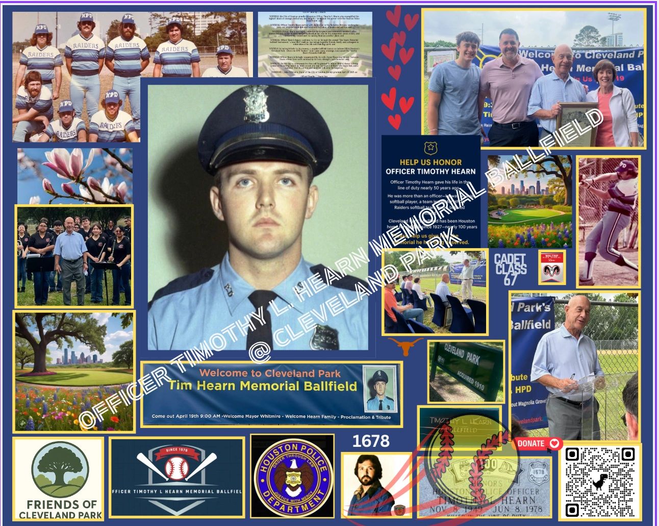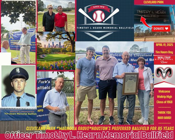 Click on the SignUpdate Tab for a Great Rededicated by Mayor Whitmire – April 19, 2025. We added two words to the name: Officer & Memorial. Thanks for Joining Us to rededicate the ballfield and meet the lovely Hearn family on "Tim Hearn Day" in Houston.
