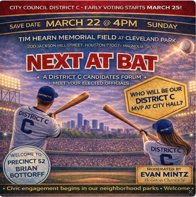 All District C Candidates Are Coming. (Seated on Field) They are Sophia Campos, Joe Panzarella, Dr. Audrey Nath, Patrick Oathout, Nick Hellyar, and Angelica Kaufman. We will also welcome All Primary Candidates in Runoffs including Annis Parker and Dr. Letitia Plummer in the runoff for County Judge (3 Minute Intros Each + 5 Minutes of Questions). In the Home Dugout will be current elected officials. Are are invited to come meet Magnolia Grove.